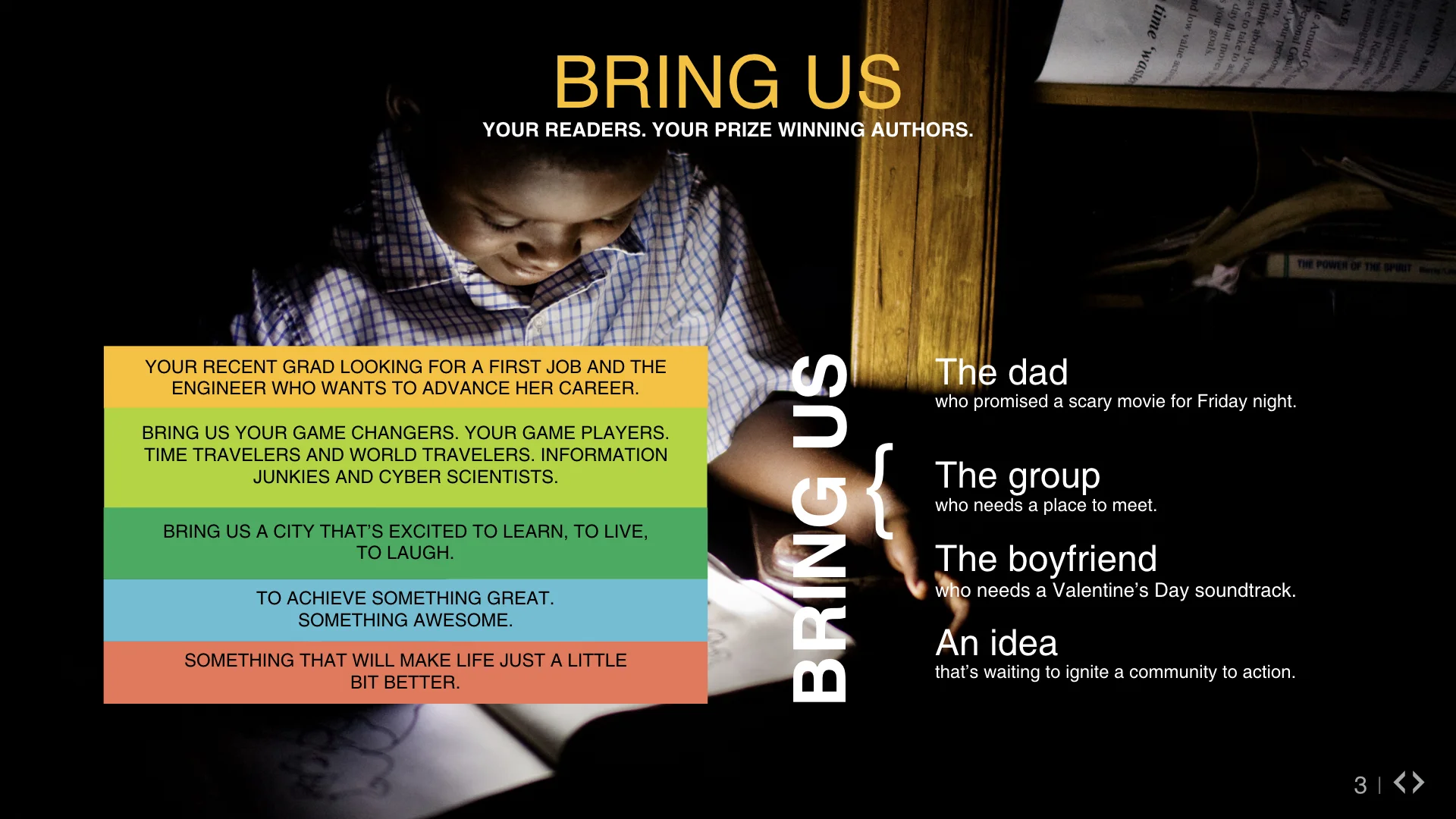 Fresh, informative and playful is the feel behind the drive for visitors to the library. The presentation echoes all things CPL and offers a welcoming ease of information delivery.